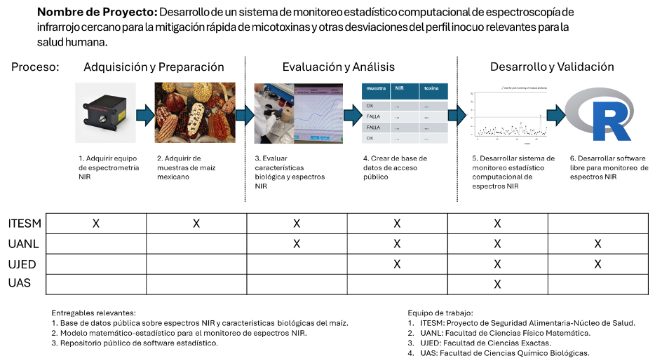 El proyecto busca crear un sistema innovador de monitoreo de maíz utilizando espectroscopía NIR para detectar y mitigar rápidamente la presencia de micotoxinas y otras desviaciones del perfil inocuo potencialmente creadas por metabolitos y microorganismos que afectan la salud humana en el maíz.